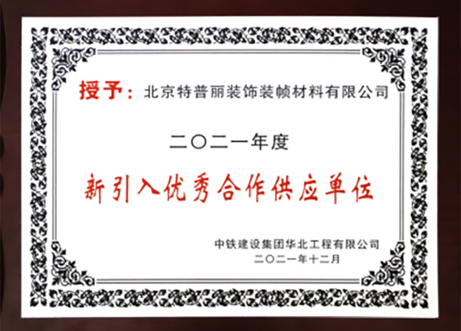 2021年12月末,由中鐵建設集團華北公司主辦的2021年度分供商大會暨總結表彰大會在河北省保定市成功召開。北京特普麗裝飾裝幀材料有限公司以“領先的研發優勢、優質的產品質量、精誠的售后服務”及在河北雄安建設中的優質供貨服務,被評為“中鐵建設2021年度新引入優秀合作供應單位”。