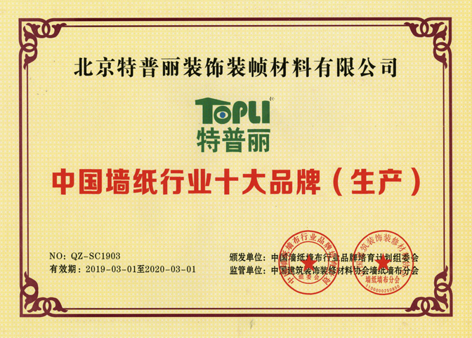 【榮譽】特普麗墻紙連續10年榮獲“中國墻紙行業十大品牌(生產)”!