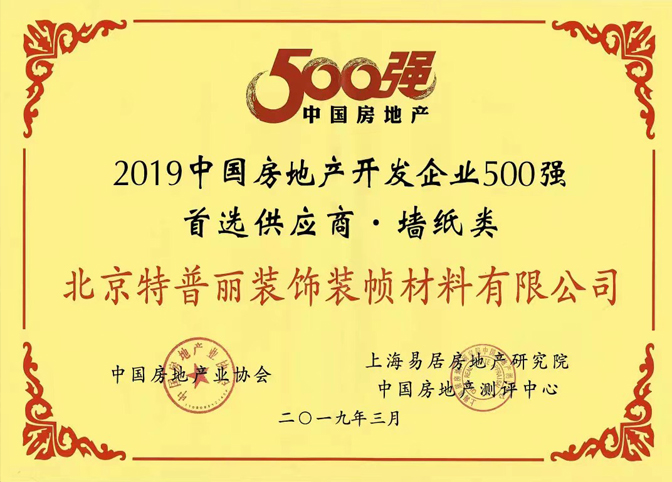 【榮譽】百強開發商見證工程實力-特普麗墻紙連續7年斬獲“2019中國房地產開發企業500強首選供應商·墻紙類”—第1名!